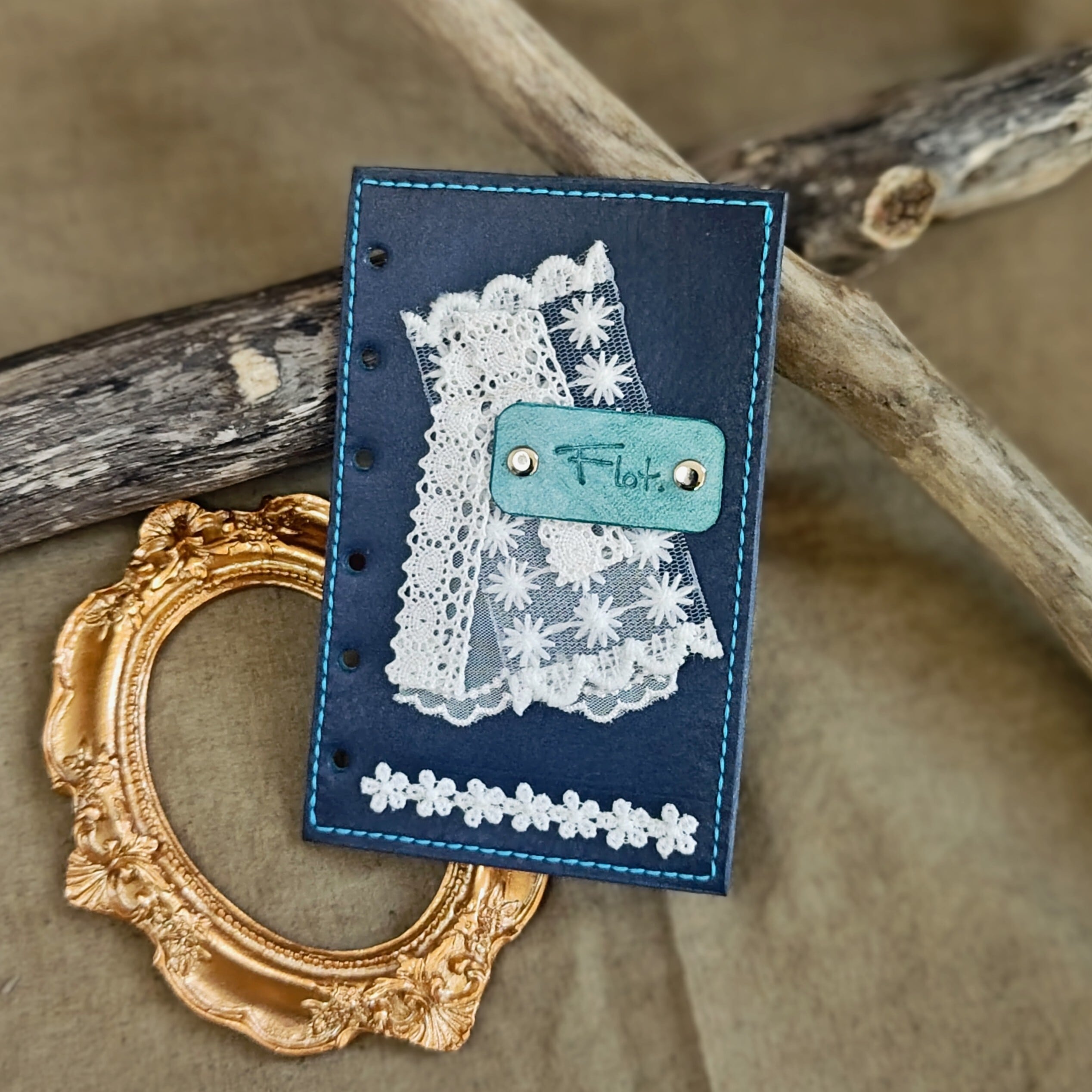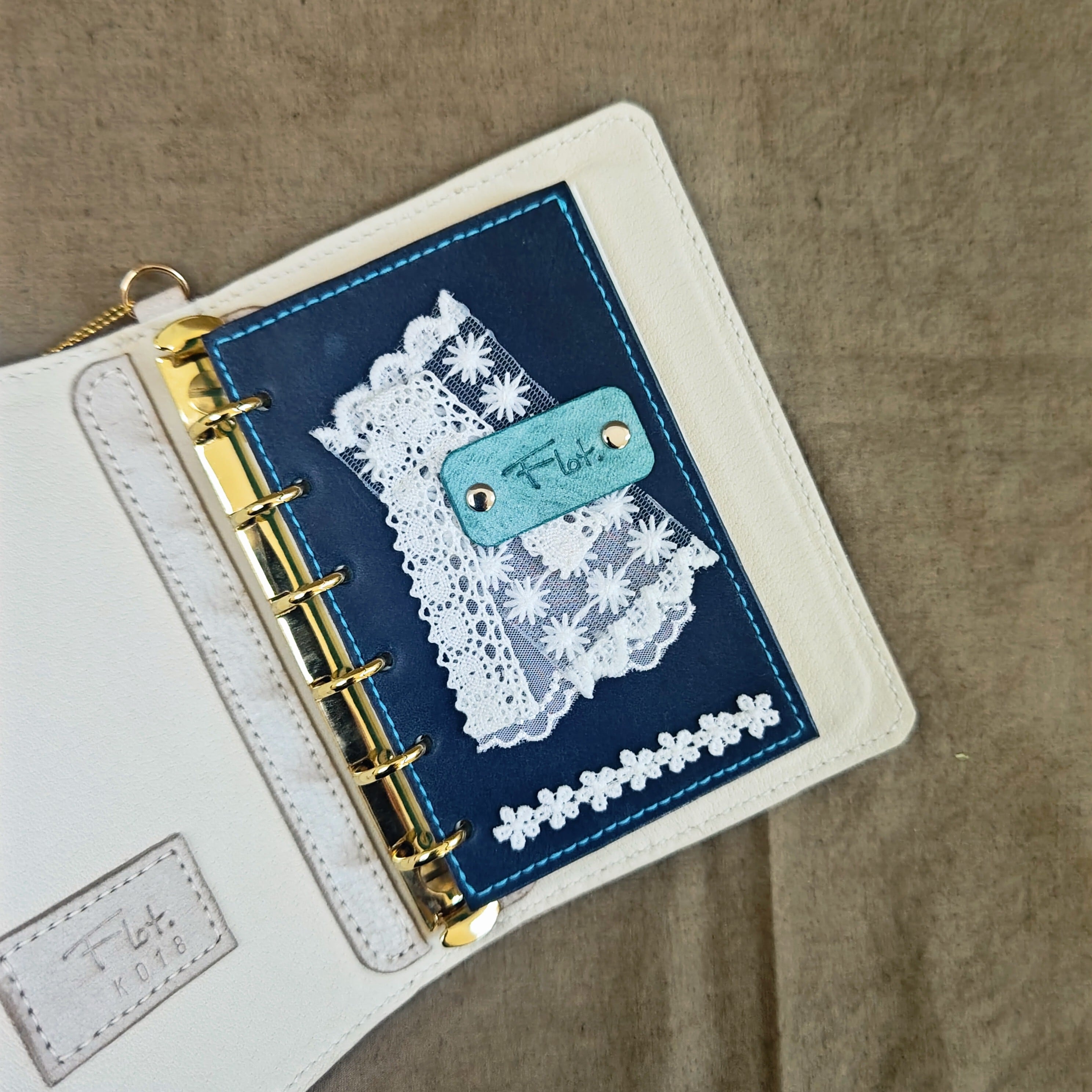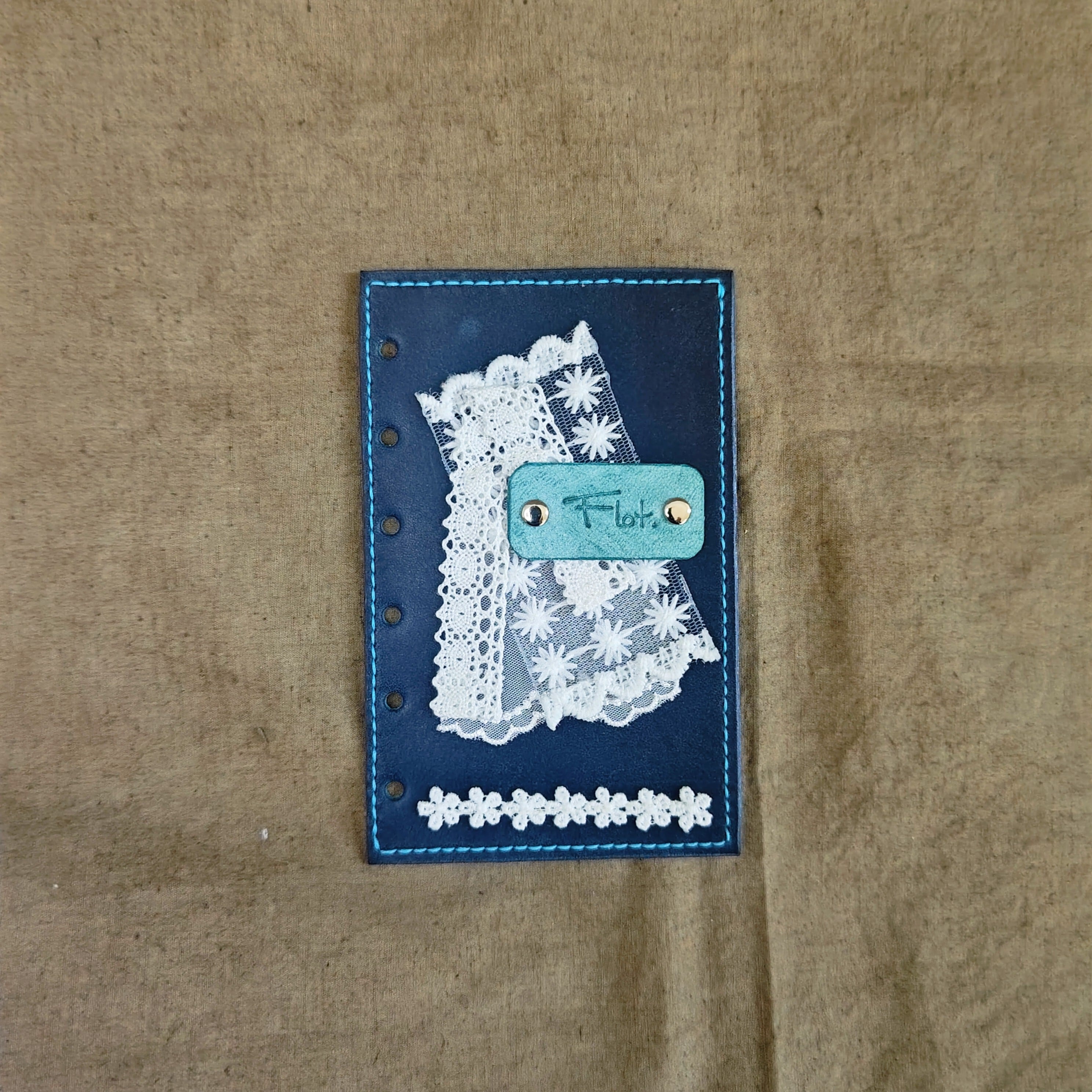 深い青の革に白いレースを添えて、