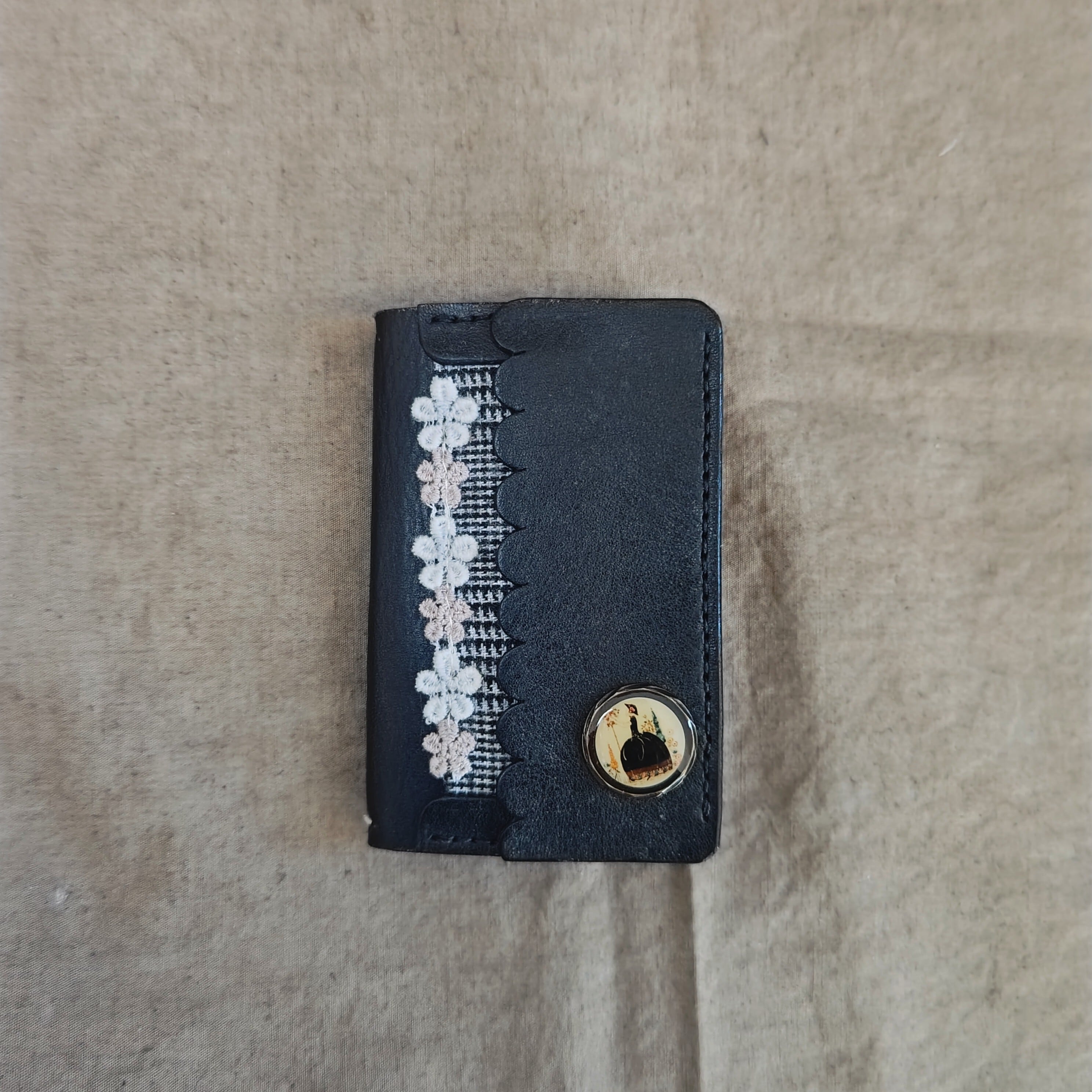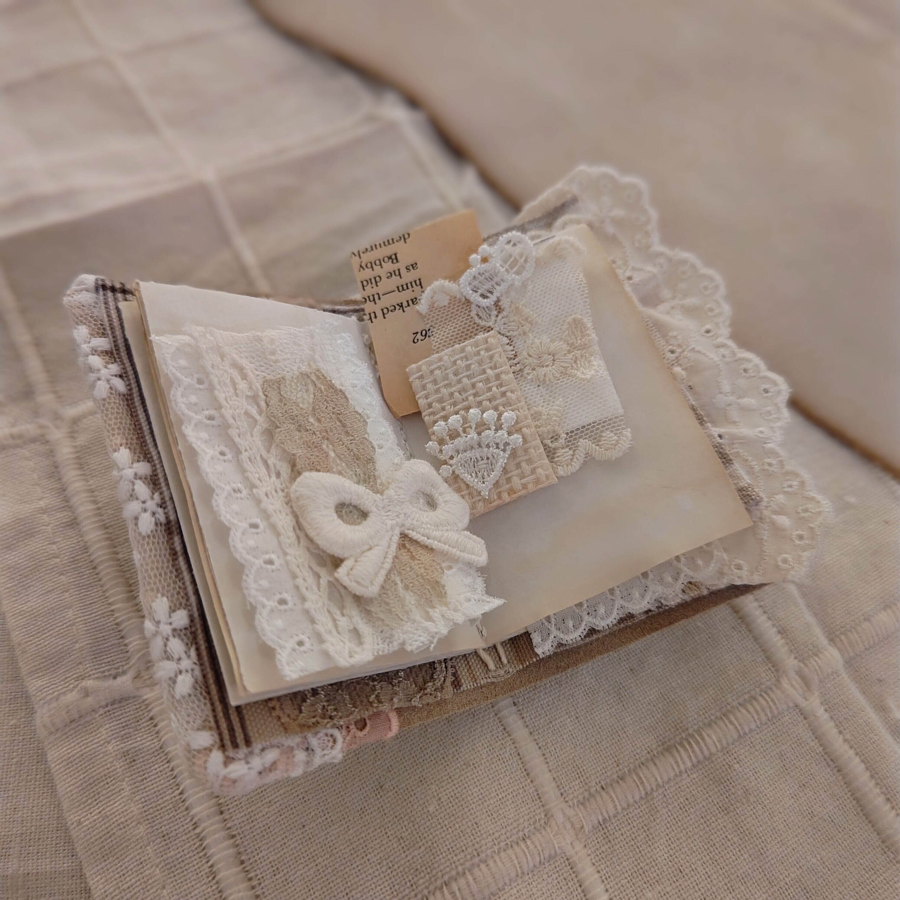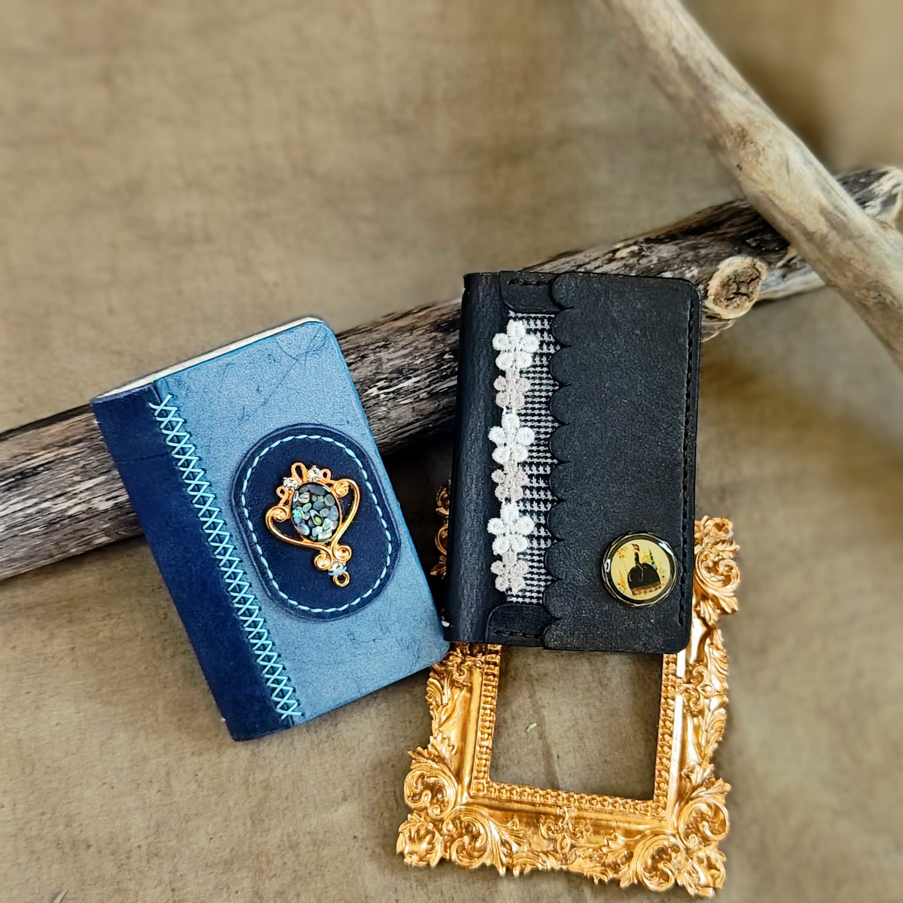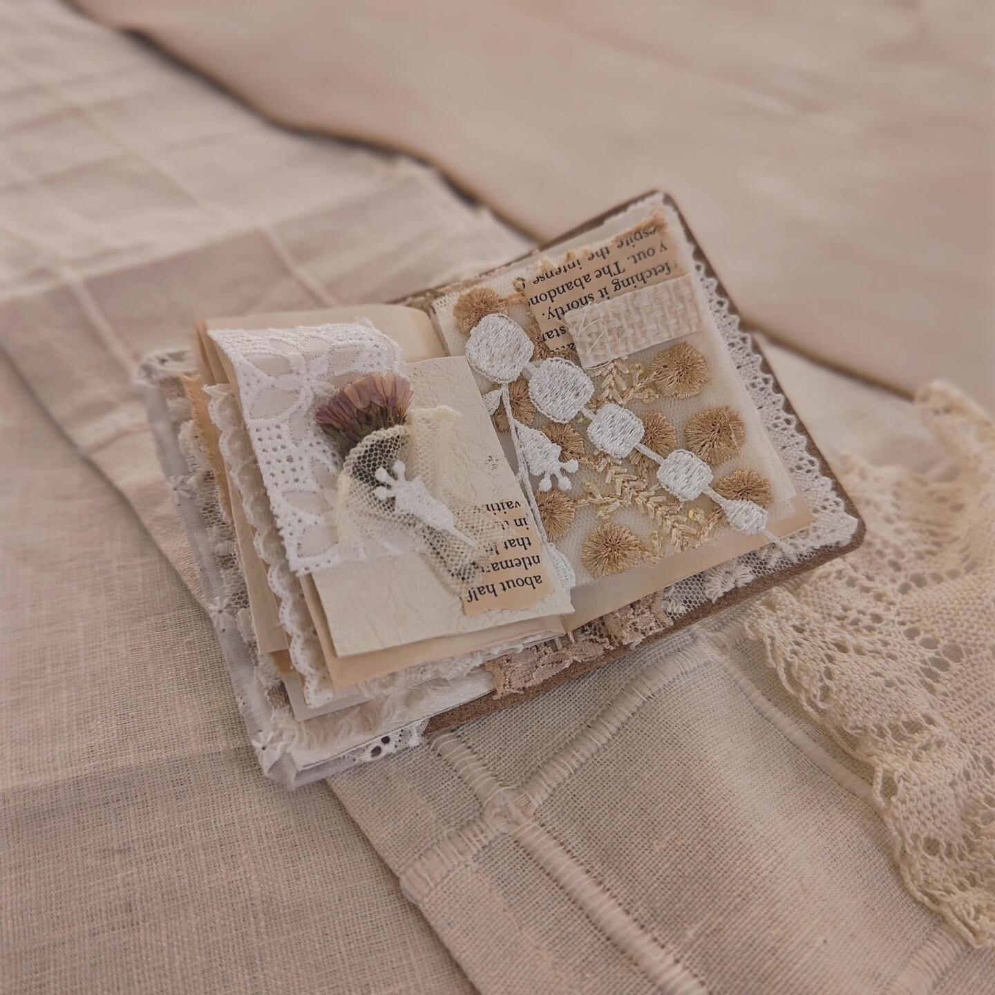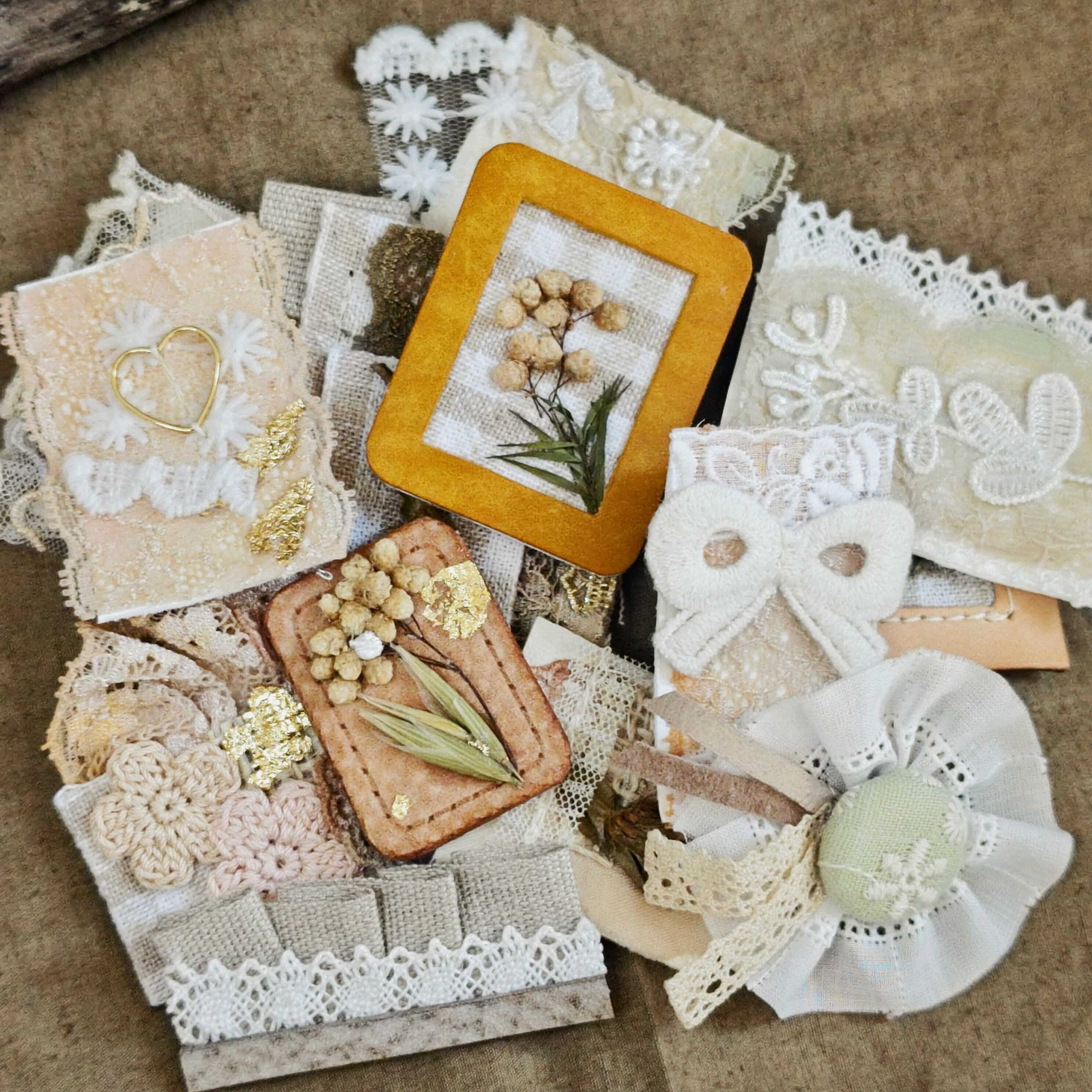布や革、レース、ドライフラワーで作った